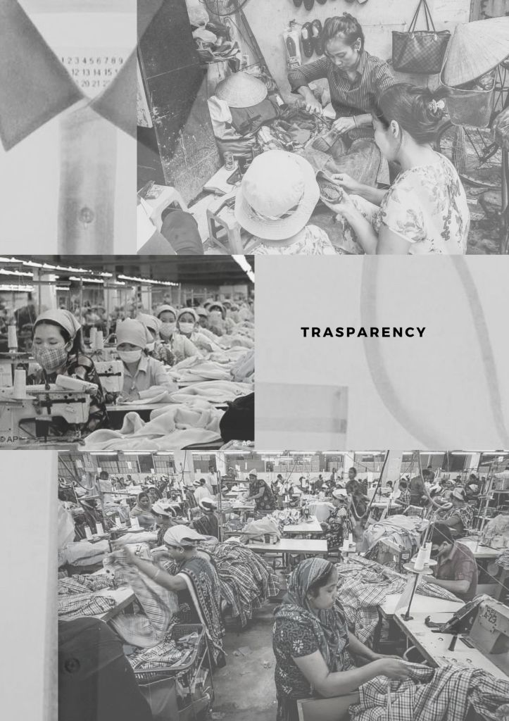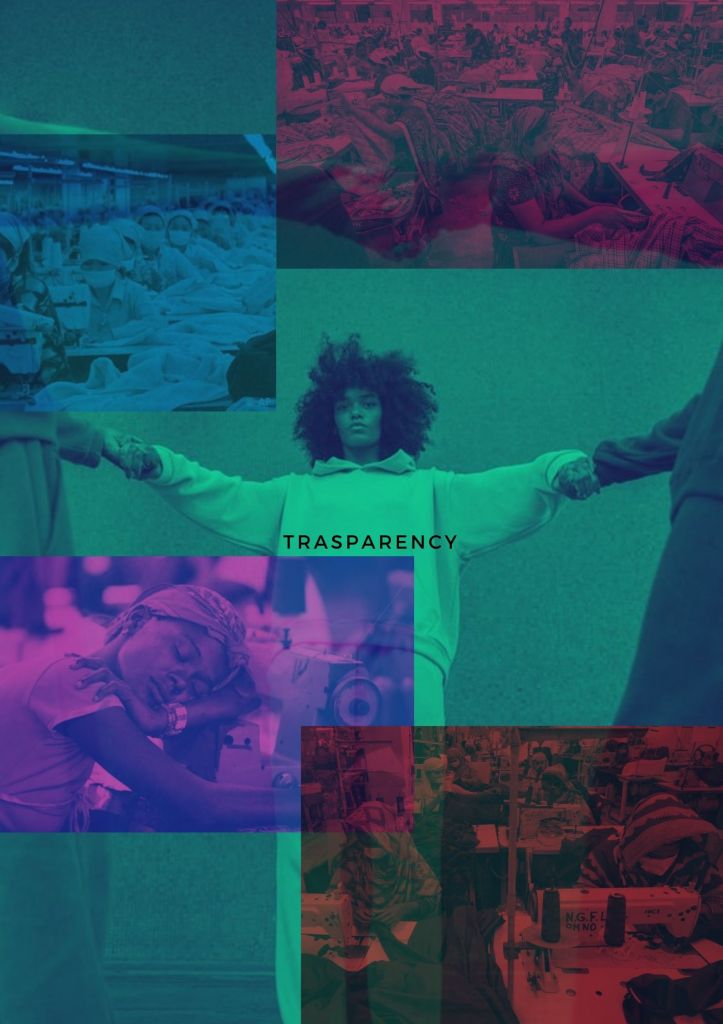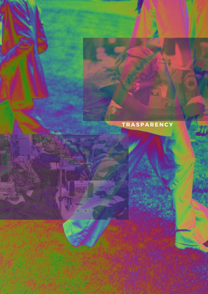 Society issues: Sometimes, when we are buying something, we do not pay a lot of attention. Transparency is affected also during this occasion. We don’t reflect when we are buying on who made our clothes. But, our common thought is only in considering the people that work at the end of this system such as the sales assistant, the store manager, the courier, etc.